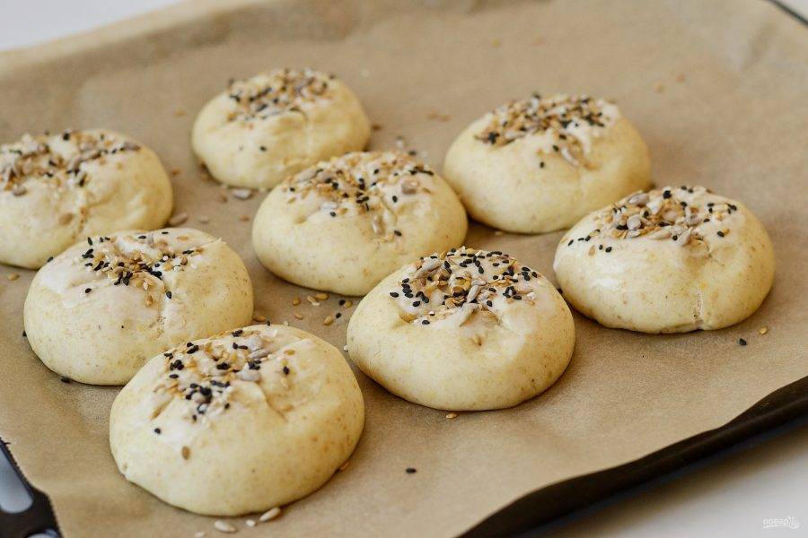 Смажьте получившейся смесью булочки. Присыпьте семечками. Выпекайте в разогретой до 190 градусов духовке 20-25 минут.
