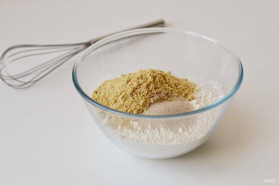 Смешайте пшеничную и льняную муку с дрожжами.