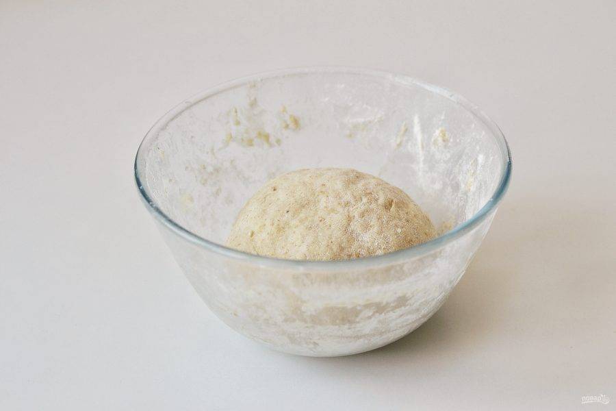 Соедините сухие ингредиенты с жидкими, замесите тесто. Накройте миску пищевой пленкой и уберите в теплое место на 1,5 часа.