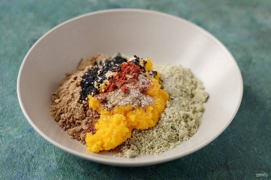 Соедините лен, тыквенные семечки и тыкву. Добавьте кунжут, специи и соль.