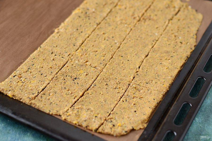 Выложите получившуюся массу толщиной 3-4 мм. на силиконовый коврик или лист для выпечки. Разрежьте на прямоугольники. Отправьте хлебцы в духовку на 2,5-3 часа при температуре 120 градусов.