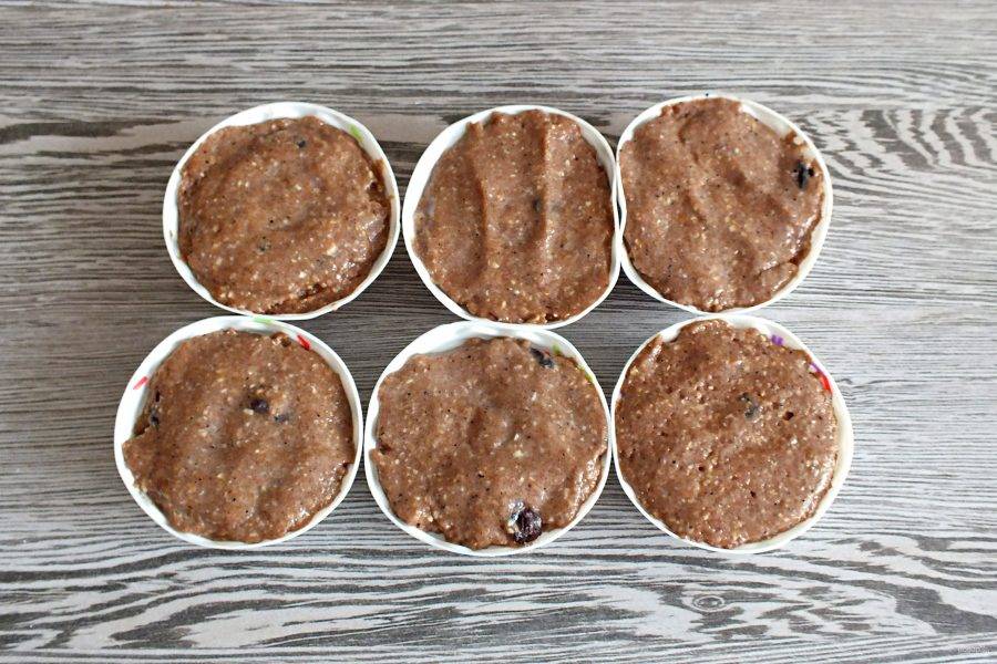 Возьмите силиконовые формочки. Смазывать их не нужно. Разложите тесто. На одну формочку должно уходить 2,5 ст.л. теста. Верх прижмите мокрой ладонью. Поставьте кексы в микроволновую печь на мощность 800 Вт. Выпекайте ровно 5 минут.