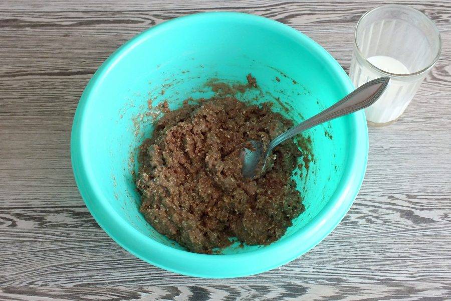 Визуально разделите молоко на три части. Вливая каждую часть, хорошо перемешивайте тесто, чтобы оно было однородным.