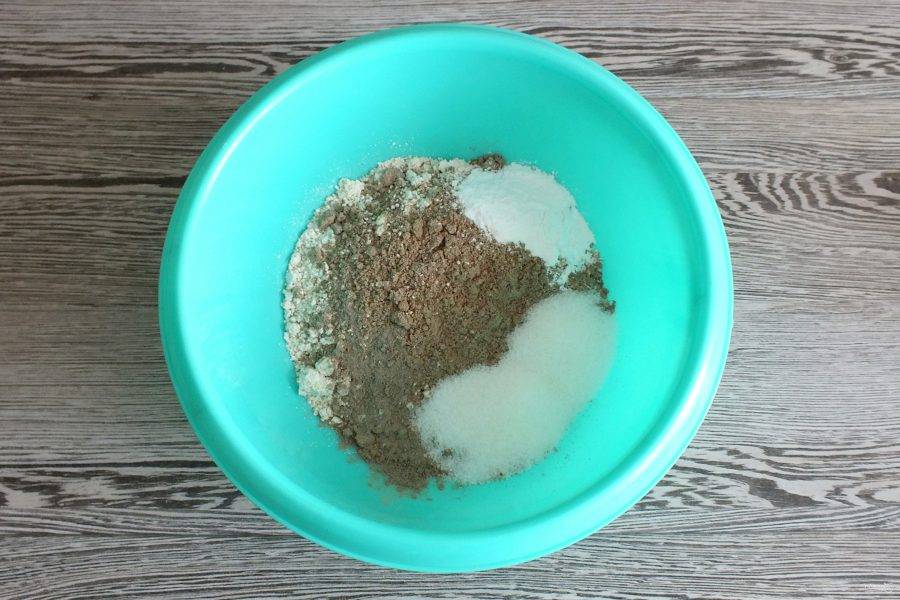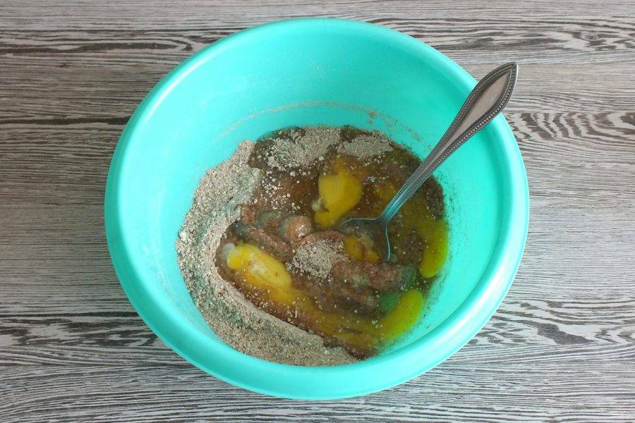 В чаше смешайте сухие ингредиенты: льняную и овсяную муку, сахар, кардамон, разрыхлитель для теста. Перемешайте.