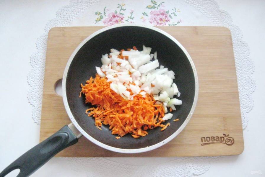 Налейте в сковороду подсолнечное рафинированное масло и 50 мл. воды. Накройте крышкой и тушите морковь с луком на среднем огне до мягкости.