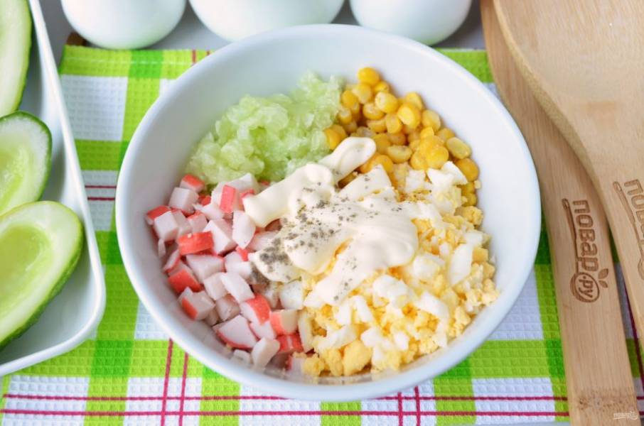 Порежьте мелко крабовые палочки, мякоть огурца, яйцо. Соедините в салатнике все ингредиенты.