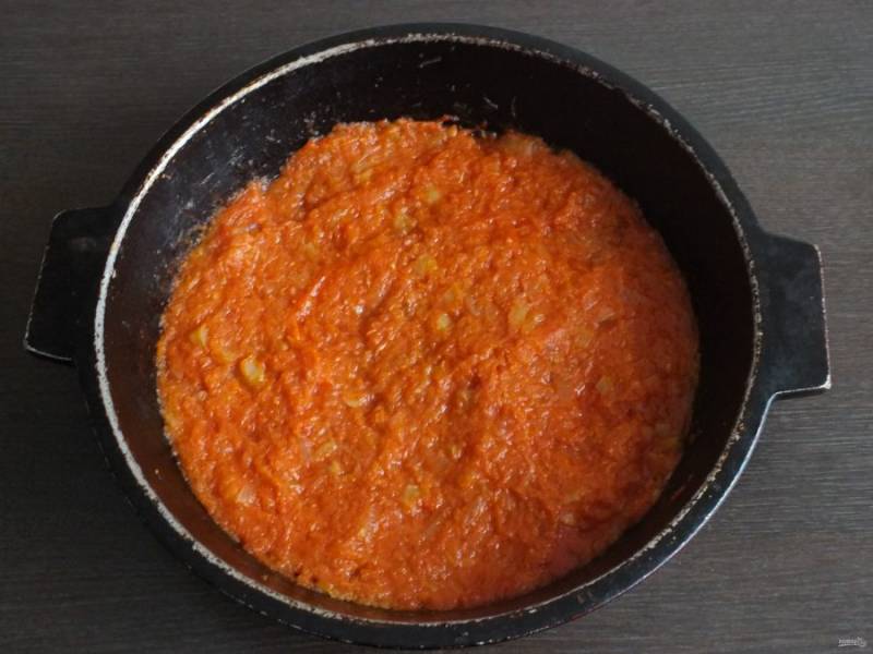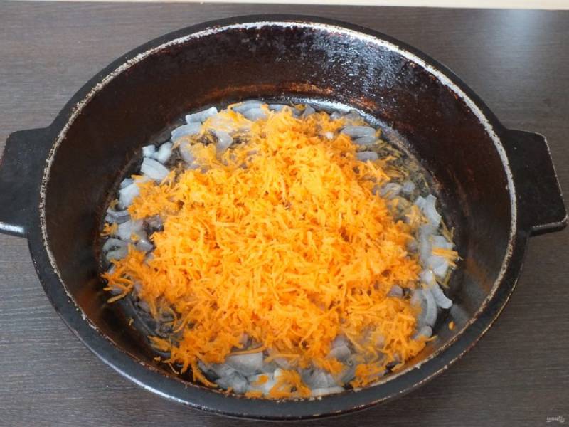 Морковь натрите на мелкой терке и добавьте к луку. Потушите в течении 7-10 минут на среднем огне, добавив 0,5 ст. воды.