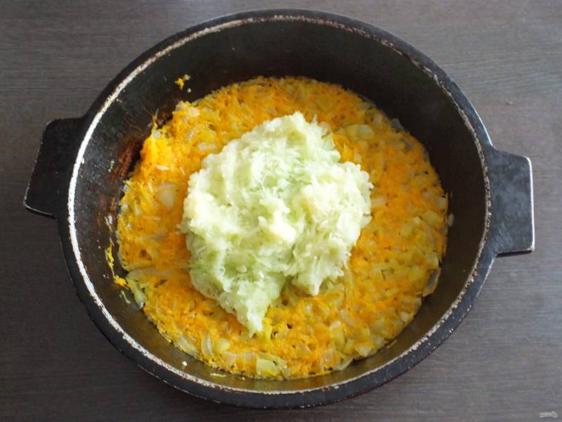 Кабачок очистите от кожуры и натрите на мелкой терке. Добавьте к овощам и потушите еще 10 минут.