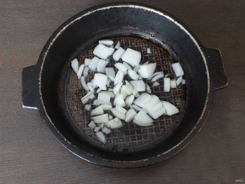 Нарежьте мелко лук. В глубокой сковороде потушите до полуготовности с растительным маслом и небольшим количеством воды.
