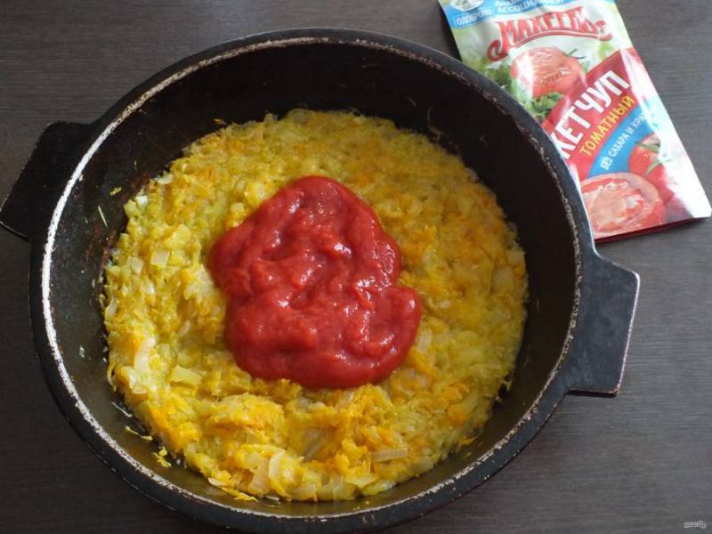 По истечении времени, добавьте кетчуп, перемешайте. При желании , добавьте специи и посолите. Накройте крышкой, подержите ена огне еще 5-7 минут и выключите огонь.