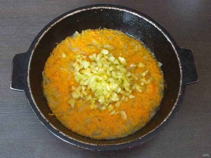 Нарежьте мелким кубиком болгарский перец и добавьте к луково-морковной массе. Если необходимо добавьте еще немного воды и продолжайте тушить в течении 10 минут.