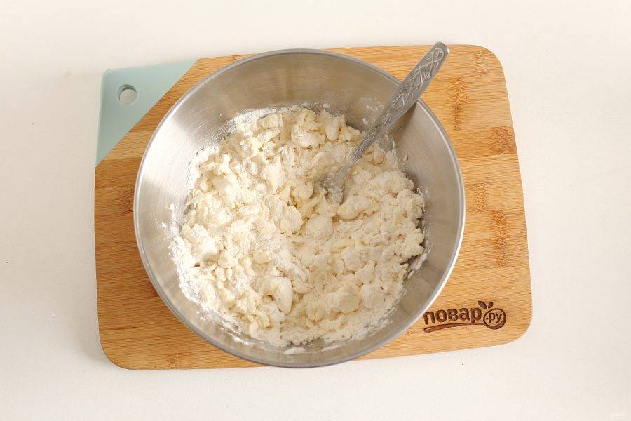 Сначала все перемешайте вилкой или ложкой, а затем переложите все на стол и руками вымешивайте тесто до того момента, пока вся мука не впитается. Тесто должно немного липнуть к рукам, но не обращайте на это внимания. Соберите тесто в шар, заверните в пищевую пленку и уберите в холодильник. В холодильнике тесто должно вылежать часа 3-4, а можно оставить его на ночь. Если вы совсем передумали печь, то уберите его в морозилку до нужного момента.