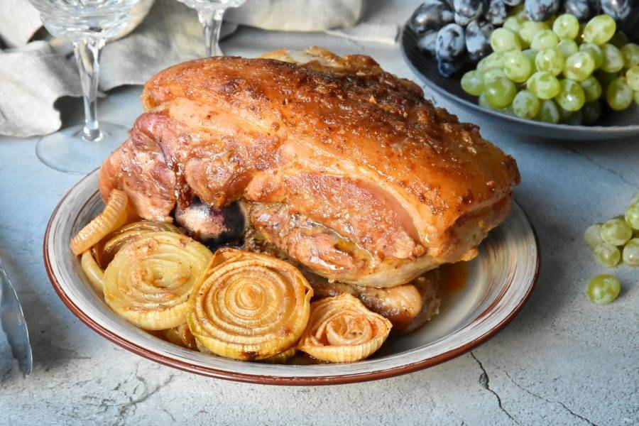 За час до готовности снимите фольгу и продолжите запекание. Готовое мясо выложите на блюдо, тут же разложите запеченный лук и подайте к столу. Получившийся после запекания мяса соус, слейте в соусник и подайте отдельно.