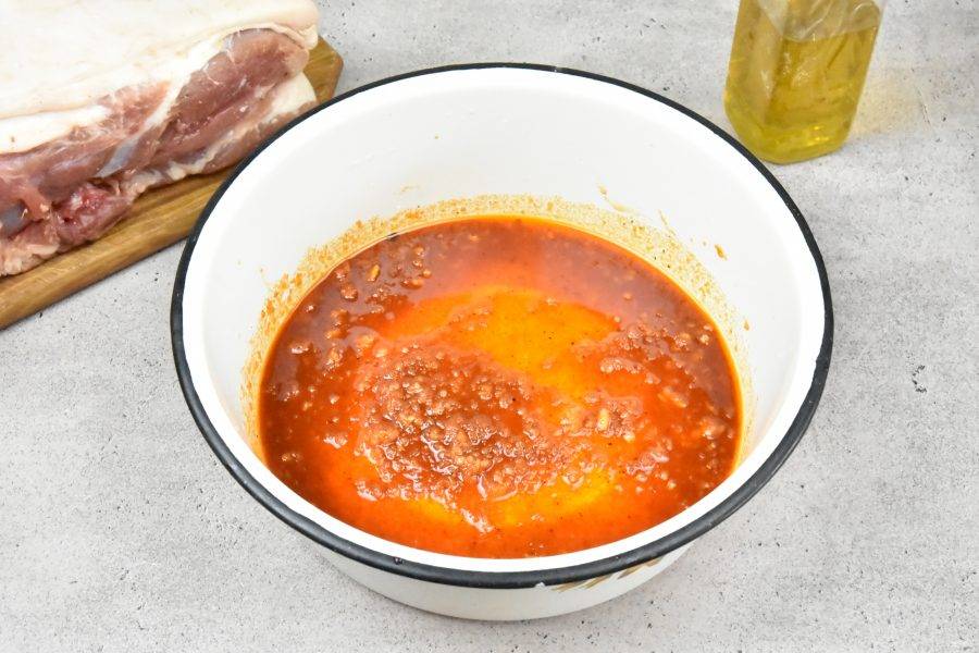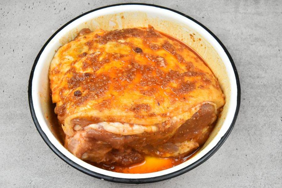 Свиную лопатку хорошо промажьте приготовленным маринадом со всех сторон. Накройте посуду полиэтиленовой пленкой и оставьте мясо мариноваться на 6-8 часов.