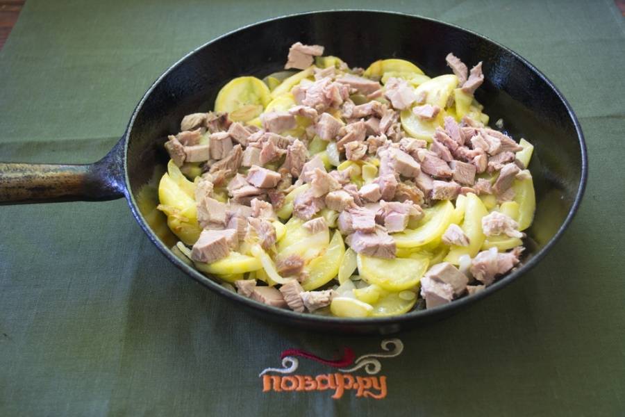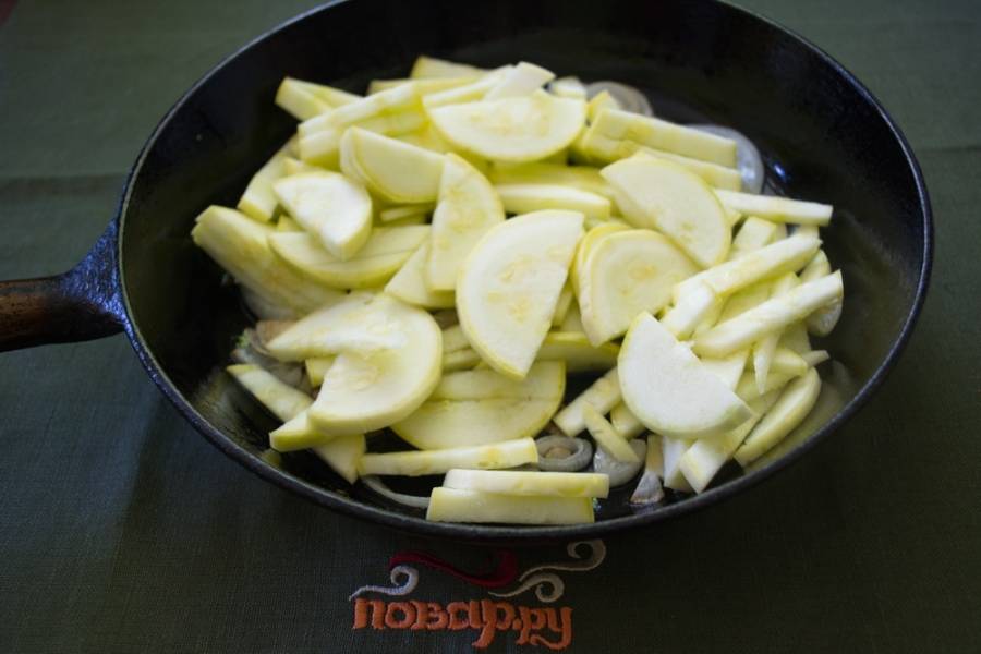 К обжаренному луку добавляем кабачки, нарезанные на ваше усмотрение. Жарим все вместе.