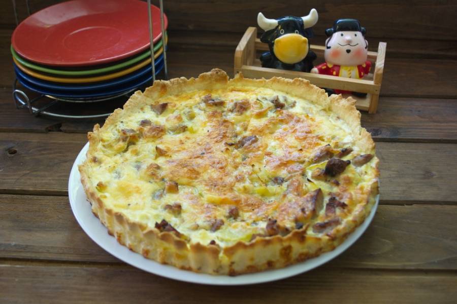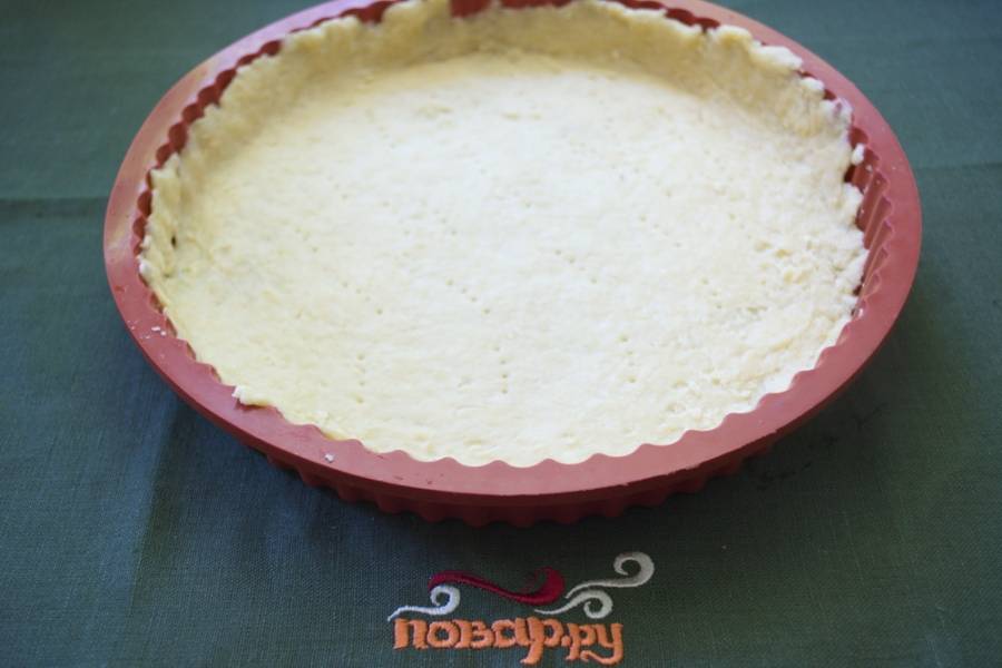 Тесто тонко раскатайте. Я накрыла тесто пищевой пленкой и катала его под ней (скалка поверх пленки). Тесто раскаталось тонко и не липло к скалке. После пласт теста перенесите в форму. Сформируйте бортики.