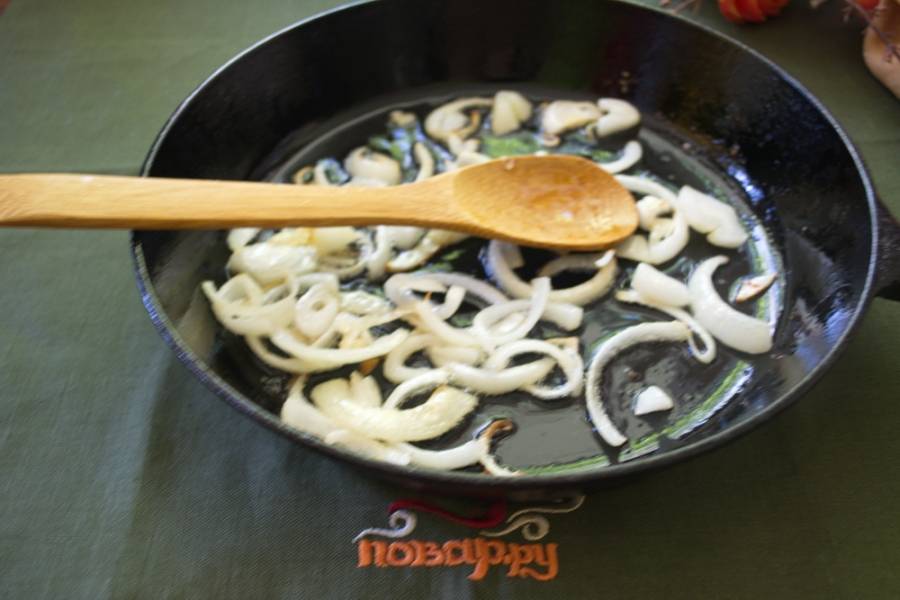 Лук нарежьте полукольцами и обжарьте на растительном масле.