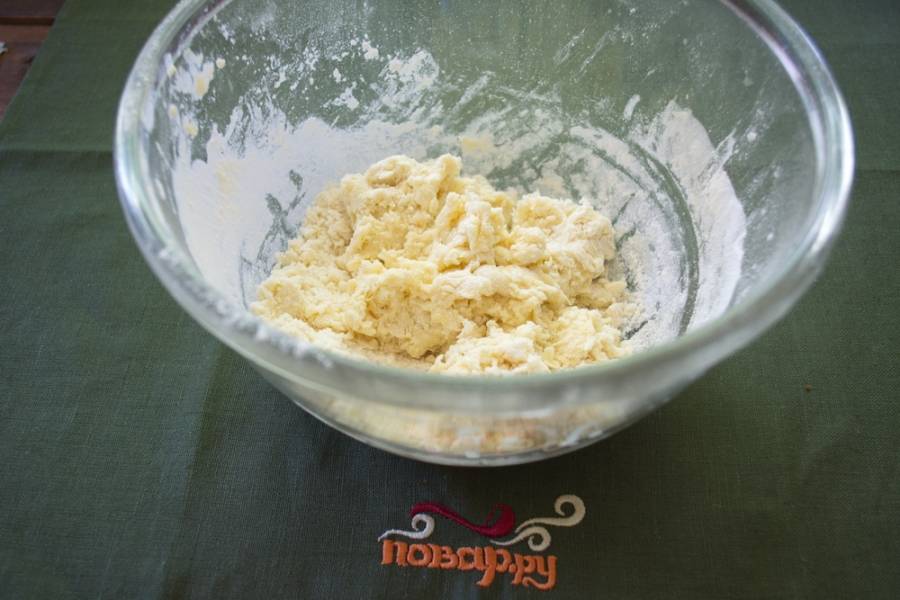 Просейте муку, разрыхлитель. Замесите быстро тесто. Влейте немного воды. Добавьте соли и быстро замесите тесто. Тесто положите в пакет и отправьте в холодильник на 1 час.