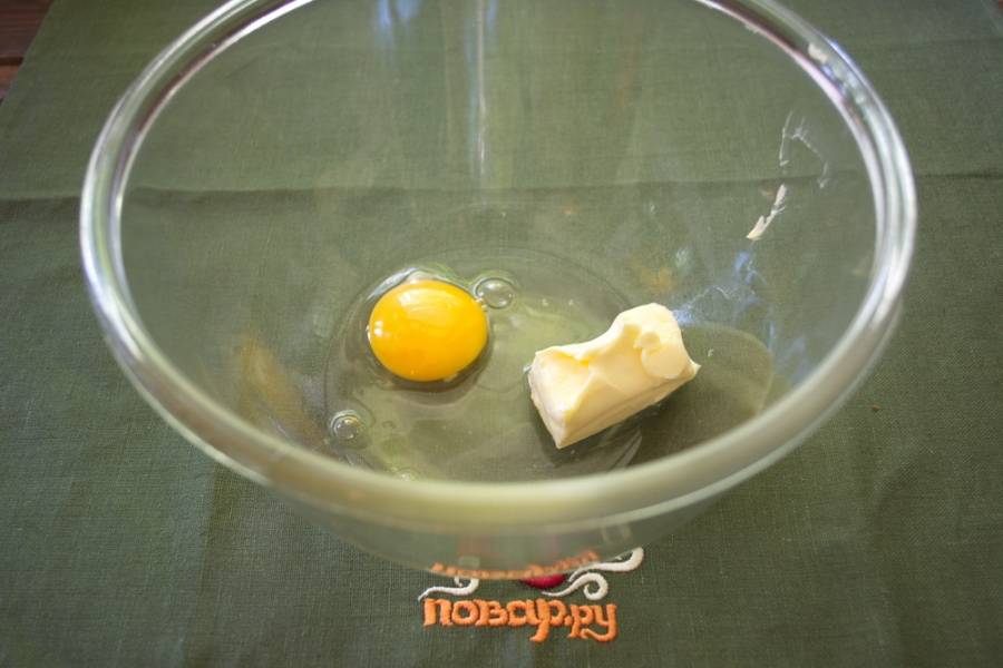 В миску вбейте яйцо. Добавьте масло сливочное (комнатной температуры), быстро взбейте.