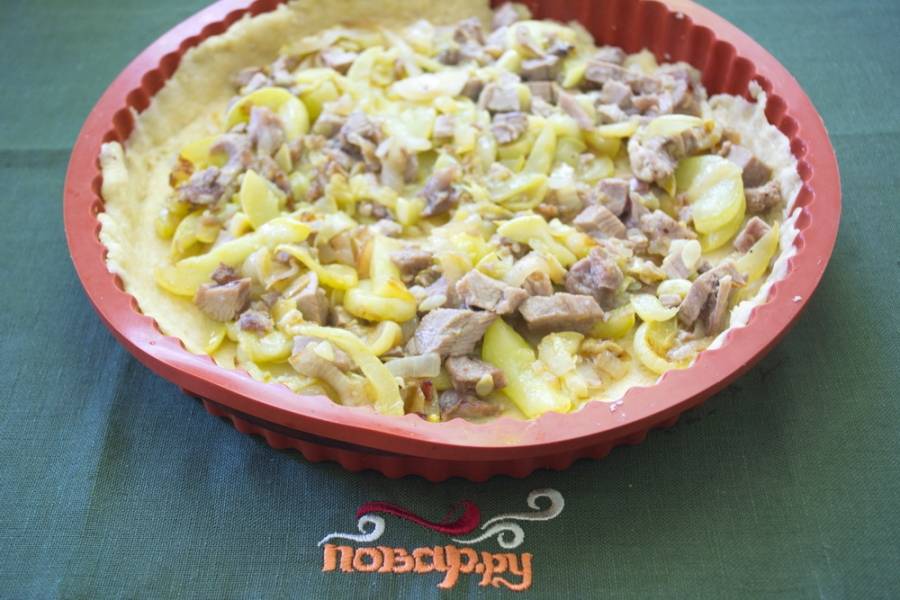 Выложите остывшую начинку на тесто. Распределите. Взбейте яйца. Залейте пирог сверху яйцом. Слегка посыпьте специями. Разогрейте духовку до 180 градусов, и запекайте пирог до готовности.