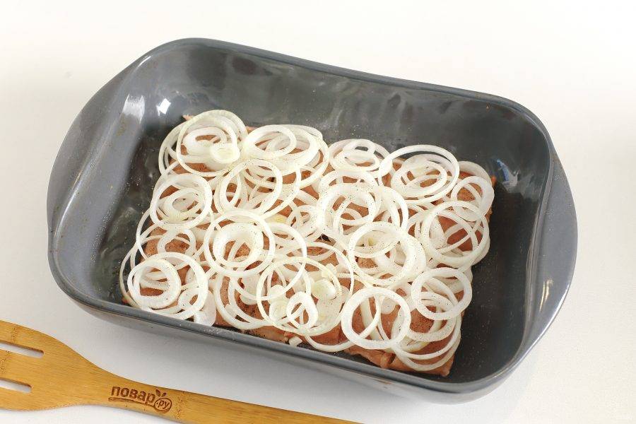Сверху распределите нарезанный кольцами лук. Лук посыпьте солью и перцем по вкусу.