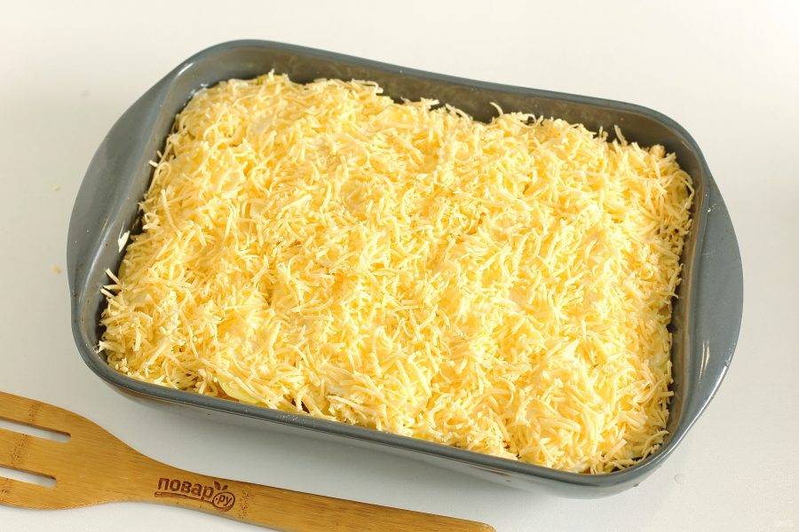 Верх смажьте майонезом и посыпьте тертым сыром. Накройте форму фольгой и запекайте в духовке при температуре 180-200 градусов около 30 минут (или до готовности картофеля). Затем фольгу уберите и дайте сыру подрумяниться.