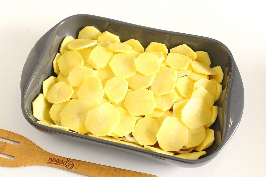 Далее в 2-3 слоя выложите нарезанный кружочками картофель. Каждый слой смажьте майонезом или сметаной и посыпьте солью.
