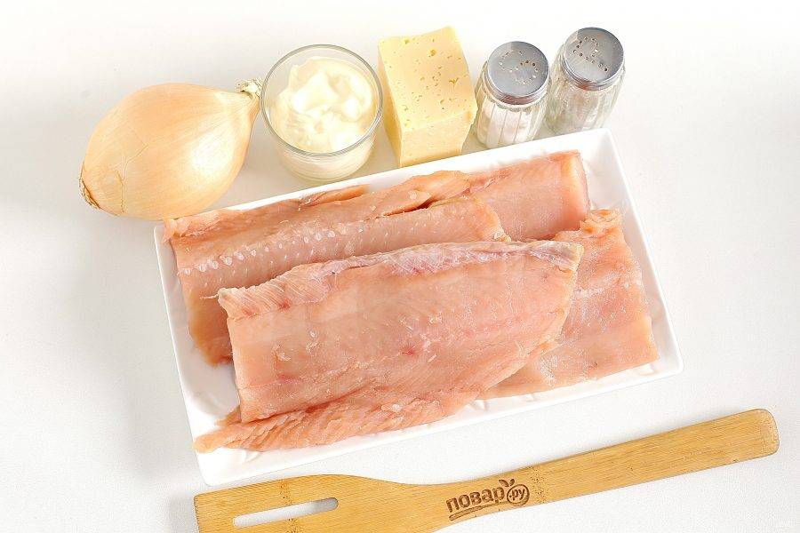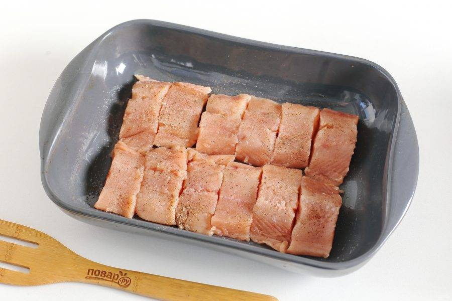 Рыбу разделайте на филе, нарежьте на порционные кусочки, выложите в смазанную маслом форму для запекания, посыпьте солью и черным молотым перцем.
