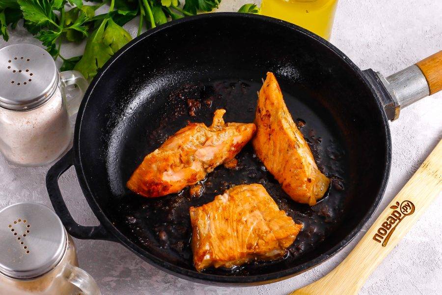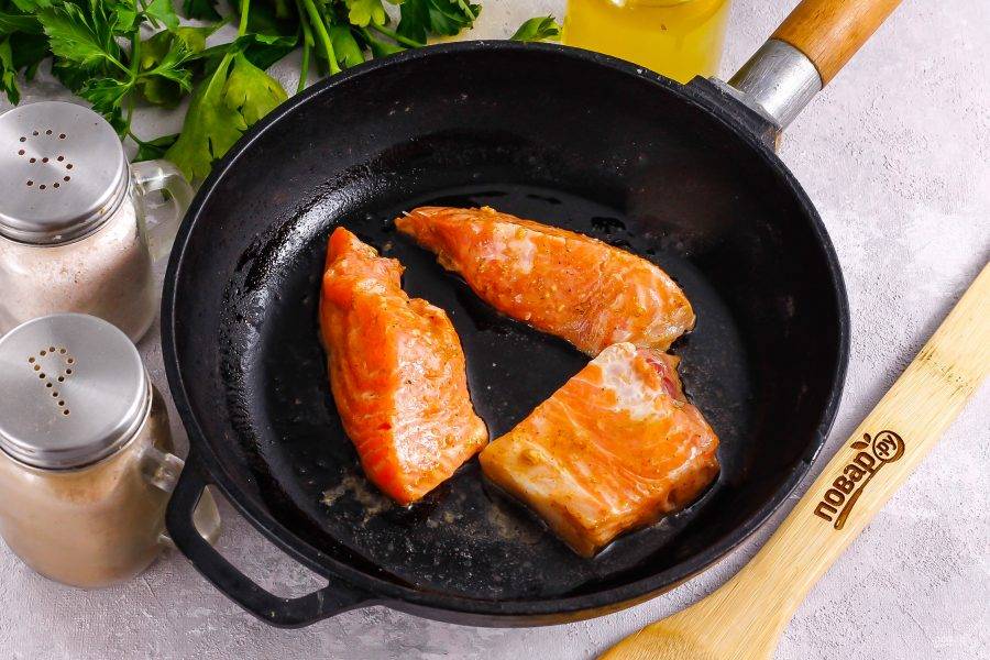 Обжарьте с каждой стороны по 2-3 минуты — не дольше, потому как красная рыба очень быстро готовится. Как только зарумянится — переверните или снимите на тарелку.