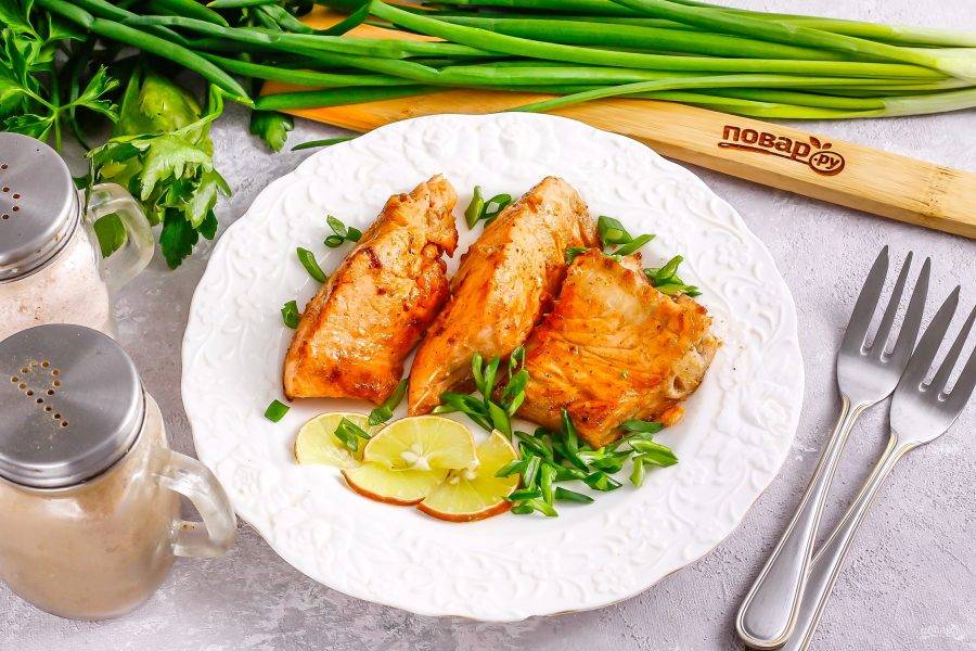 Выложите лосося по-тайски на тарелку и присыпьте измельченным зеленым луком.