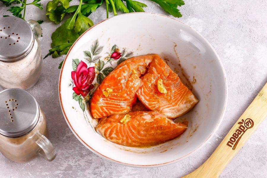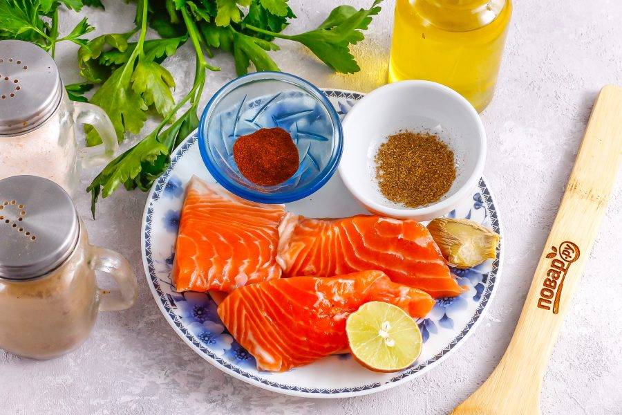 Подготовьте указанные ингредиенты. Кусочки филе лосося разморозьте, если приобретали их замороженными.