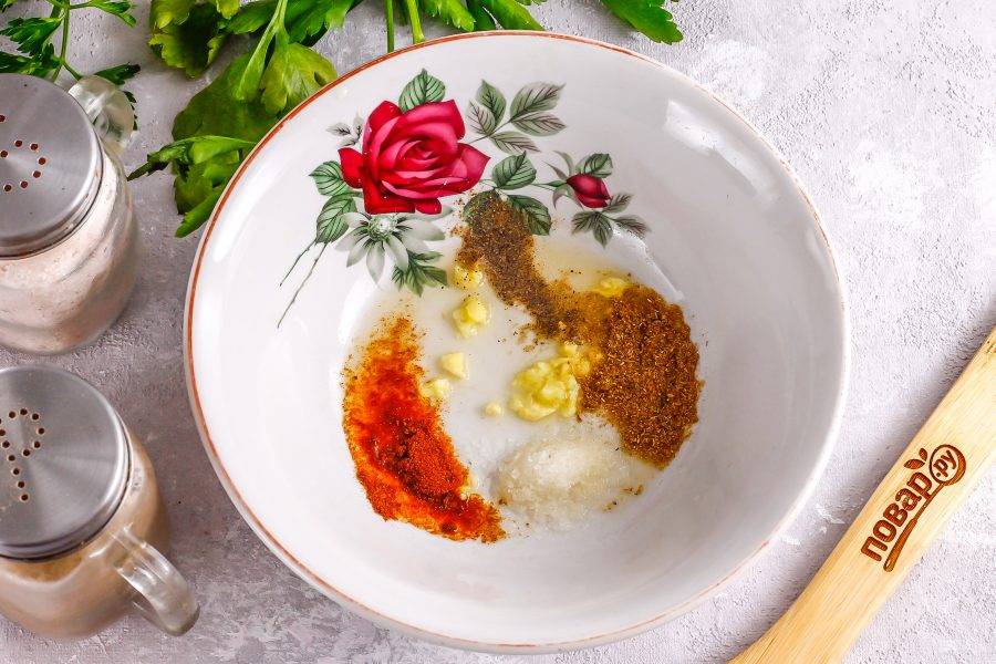 Имбирь очистите от кожуры, нарежьте ломтиками и измельчите. Высыпьте нарезку вместе с острым красным перцем, молотым черным перцем, молотым кориандром и солью в глубокую емкость. Выжмите туда же сок лайма и перемешайте.