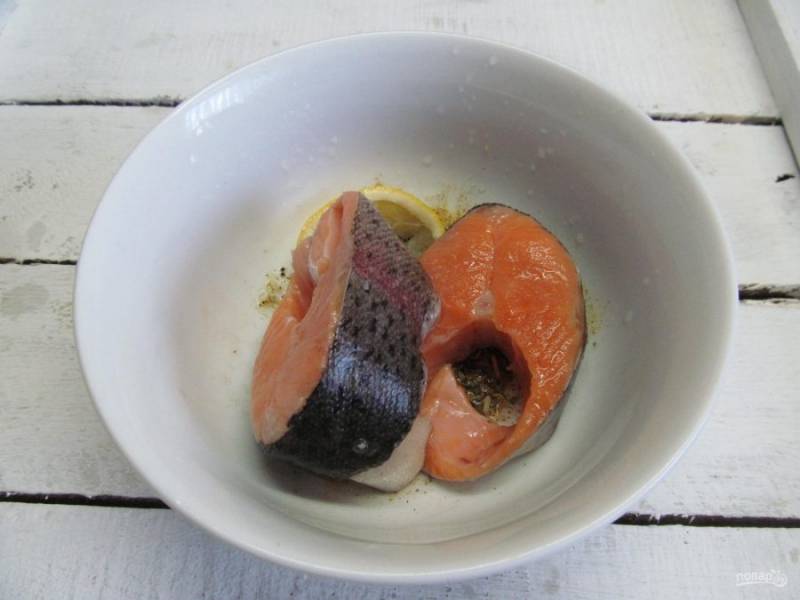 Сверху выложите стейки лосося.