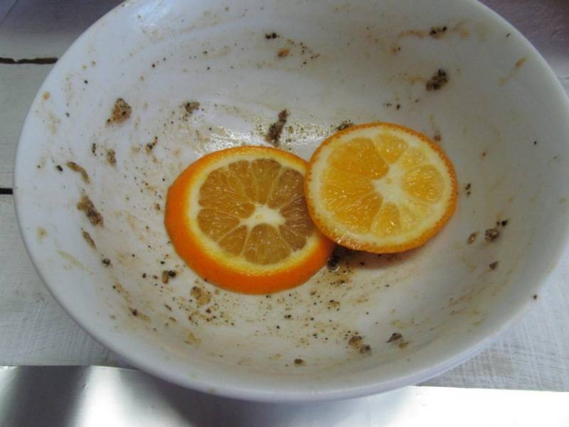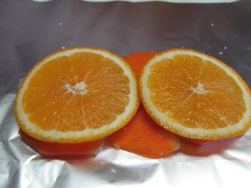Отрежьте еще 2-3 кружка апельсина и соберите ими специи, в которых мариновалась рыба.