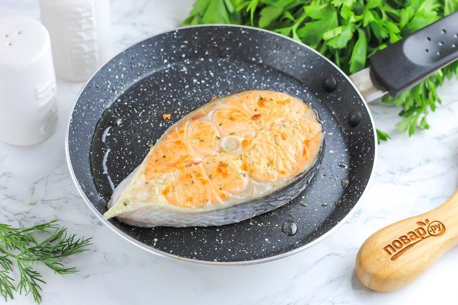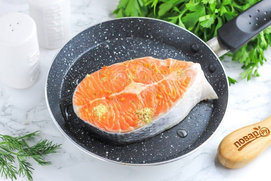 Прогрейте сковороду на плите и добавьте на нее 20 мл. растительного масла. Натрите лосось с обеих сторон приправой для рыбы и выложите стейк на сковороду. Обжарьте примерно 4-5 минут с одной стороны.