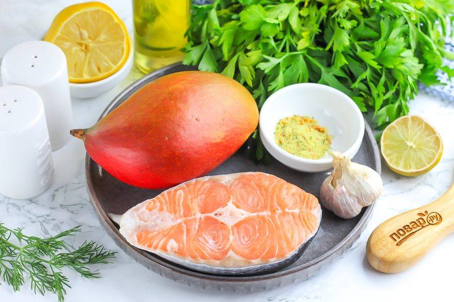 Подготовьте указанные ингредиенты. Стейк лосося тщательно очистите от чешуи, промойте в воде и обсушите бумажными салфетками с обеих сторон.