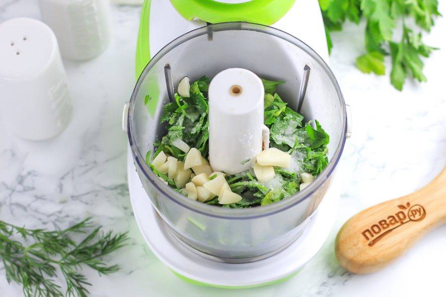Очистите зубчики чеснока от шелухи и промойте вместе с кинзой либо петрушкой. Выложите в чашу измельчителя. Добавьте лимонный сок и растительное масло, соль и молотый черный перец. По желанию можно добавить щепотку красного острого перца. Измельчите все 3-4 минуты, получая сочный соус.