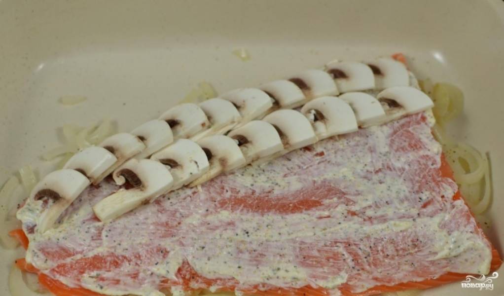 Затем лук перекладываем в удобную форму для выпекания. сверху кладем кусок лосося. Солим, перчим его по вкусу и смазываем майонезом.