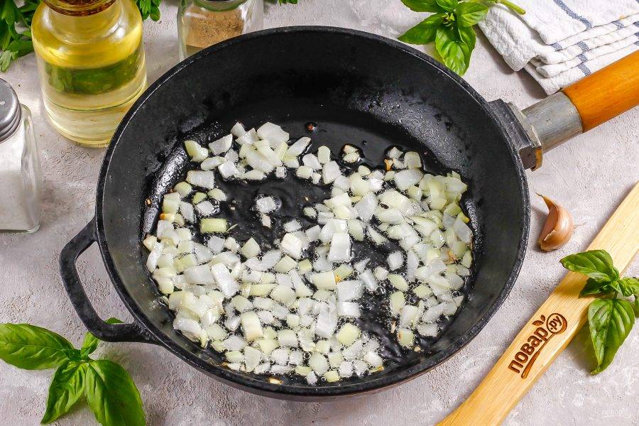 Очистите чеснок. Половину луковицы и чеснок нарежьте мелким кубиком и отпассеруйте в растительном масле на сковороде примерно 3-4 минуты.