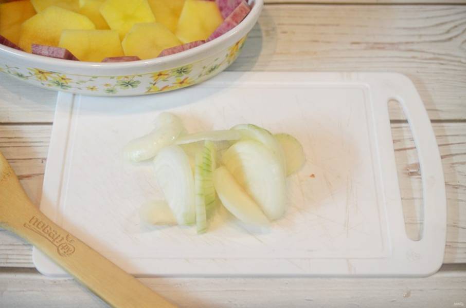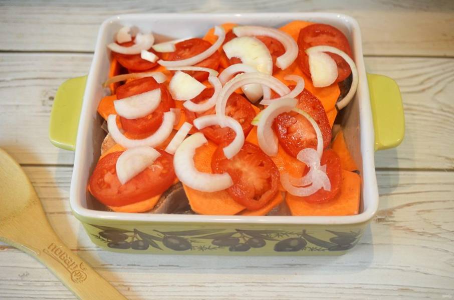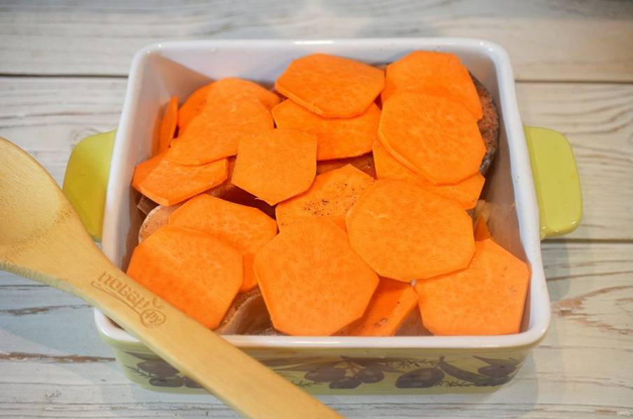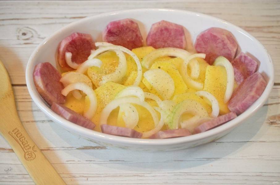 6. Выложите половину лука на картофель. Посолите, поперчите.