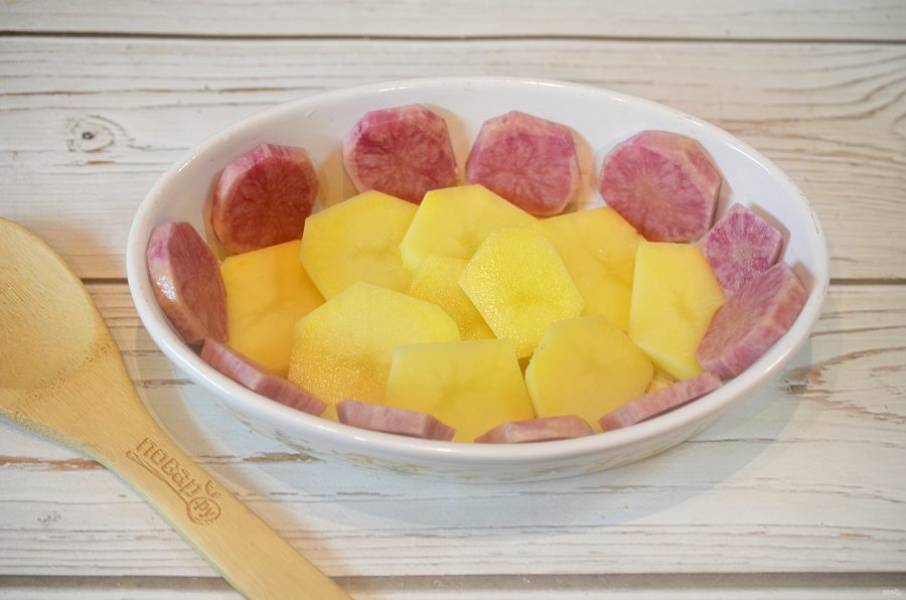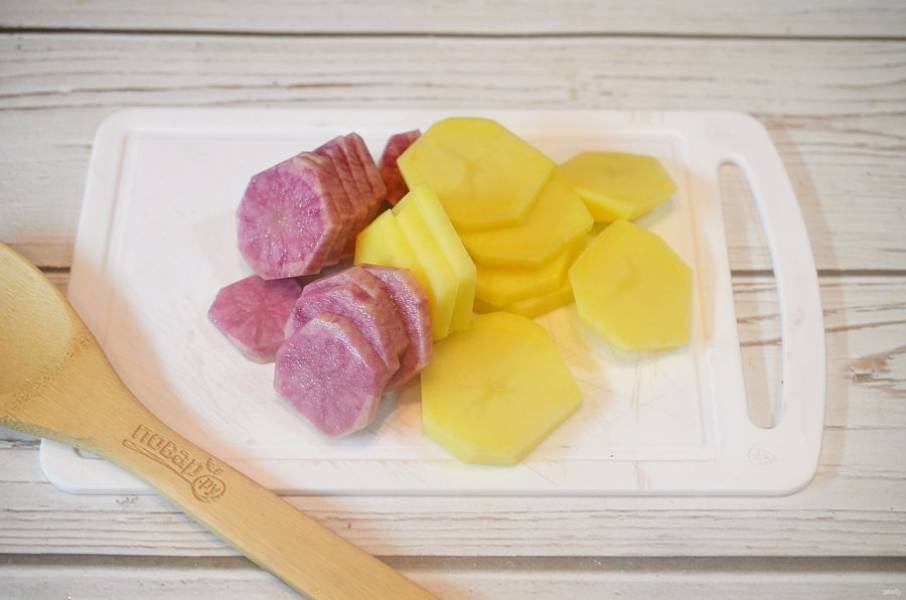 2. Картофель почистите и нарежьте кружками. У меня обычный и розовый картофель.