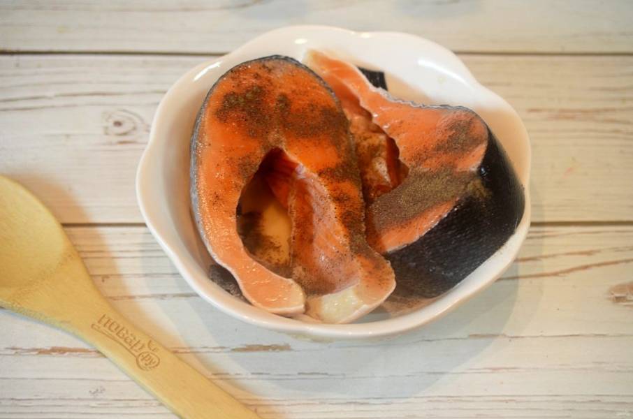1. Стейки лосося помойте, замаринуйте в лимонном соке, посыпьте перцем. Оставьте минут на 20.
