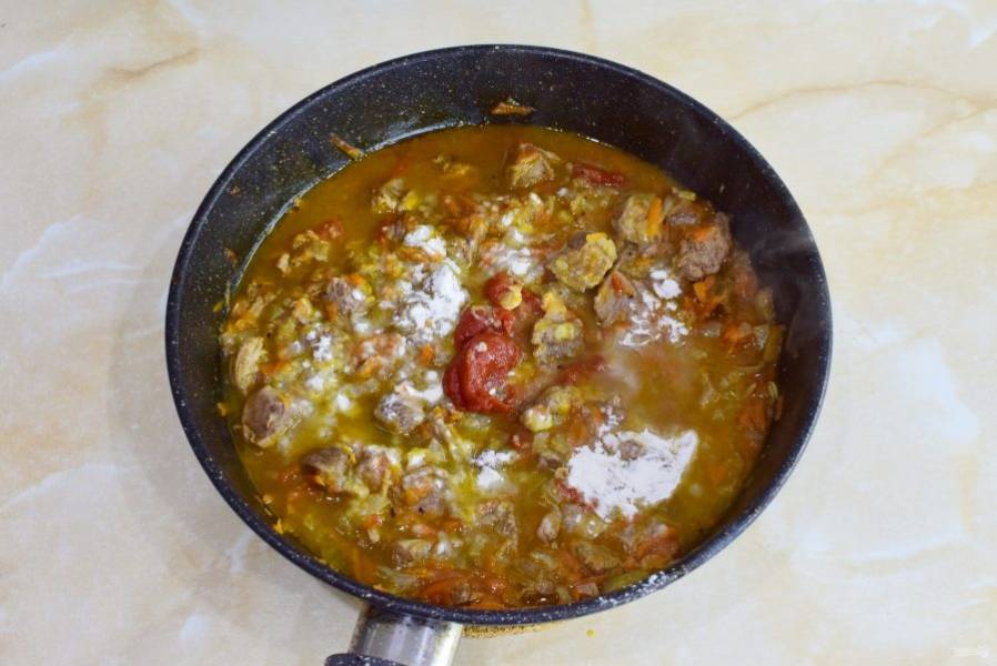 Когда мясо будет почти готово, посыпьте его мукой через ситечко. Добавьте томатную пасту. По вкусу подсолите и добавьте специи. Все смешайте.