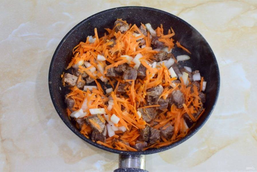 Очистите лук и морковь. Измельчите любым удобным способом и выложите в сковороду к мясу. Обжарьте все вместе еще 3-5 минут.