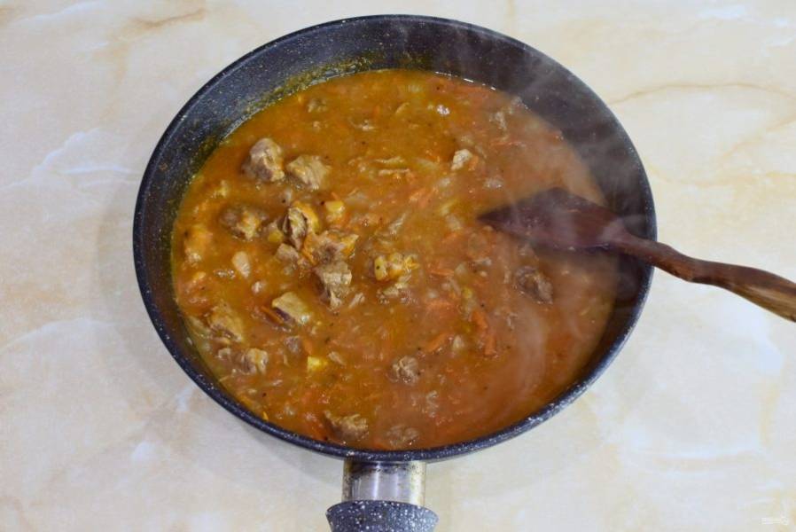 Затем подлейте в сковороду горячую воду. Накройте крышкой и тушите на небольшом огне 1 час. При необходимости можно добавить ещё воды.