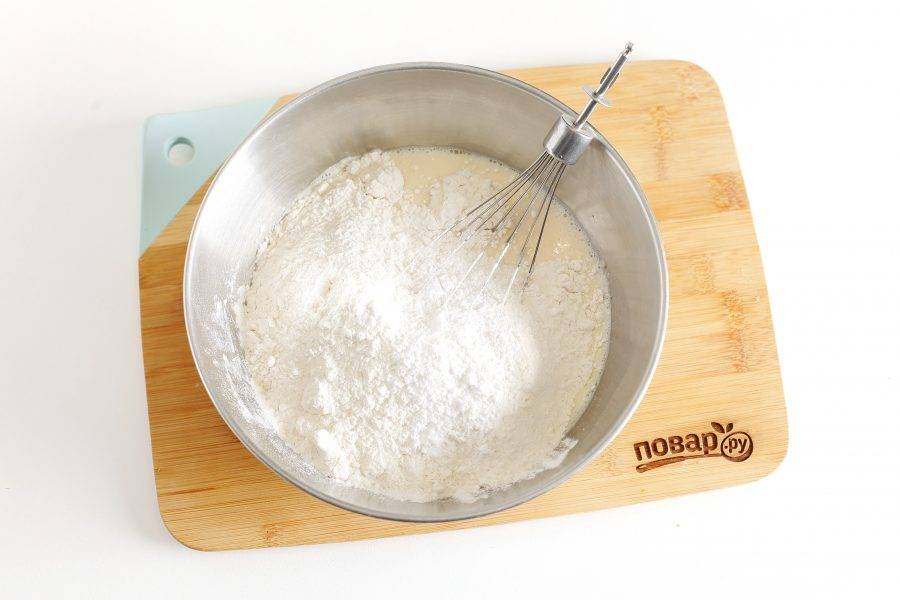 Добавьте молоко, муку и разрыхлитель.