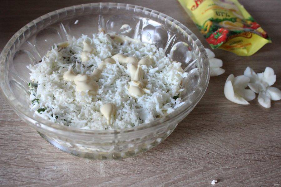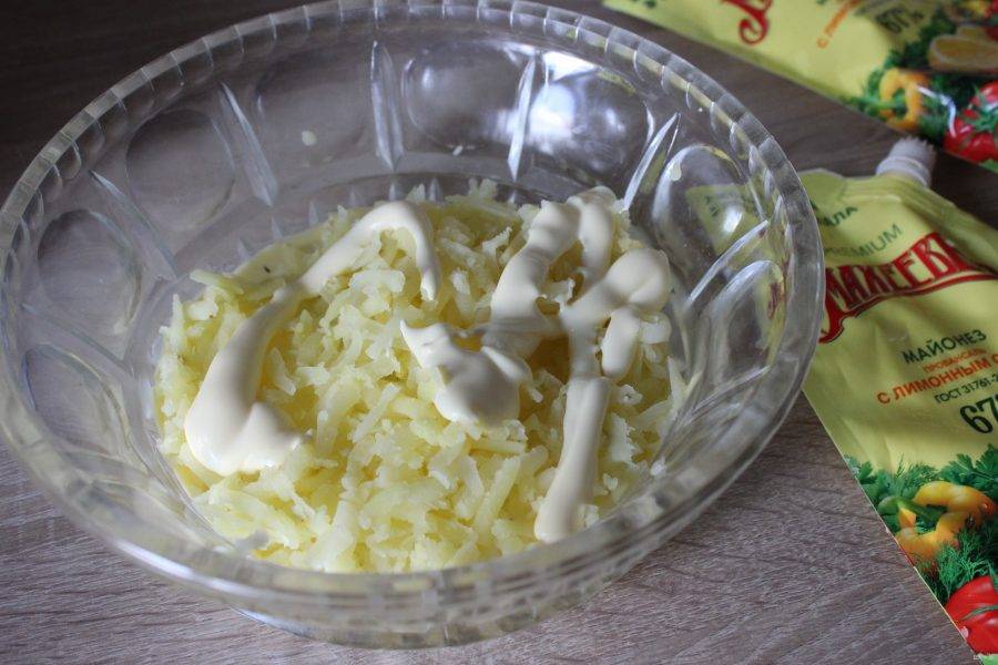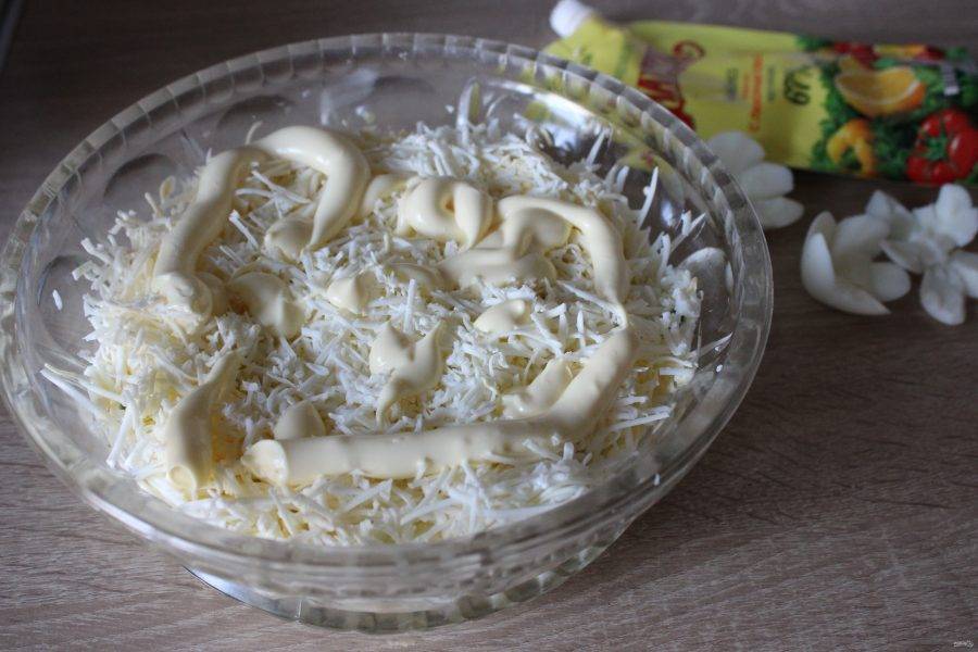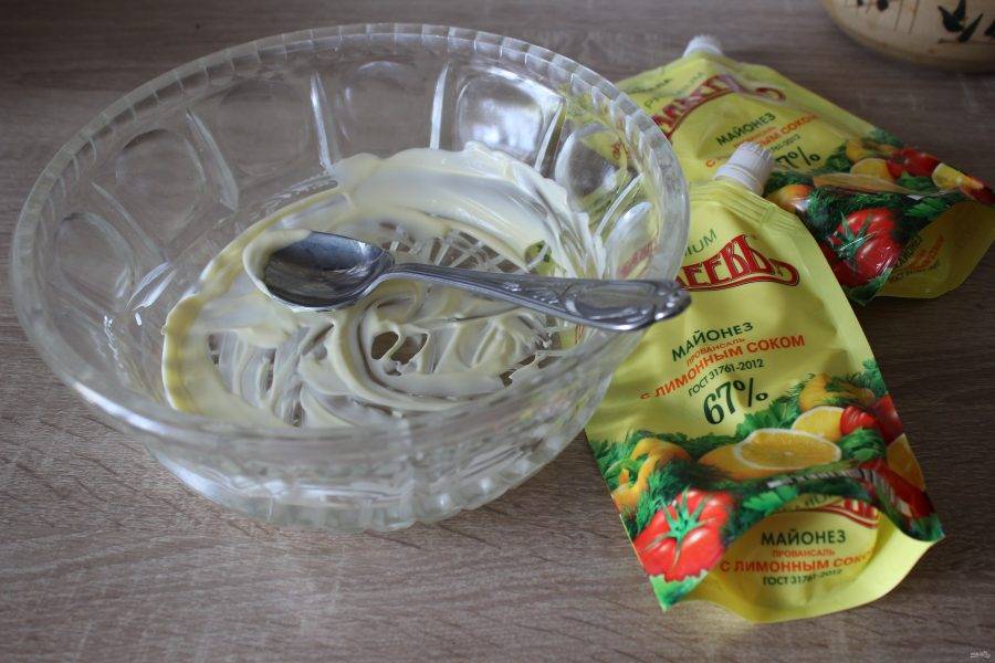Дно салатника смазать майонезом. Каждый слой, кроме последнего, промазать майонезом.