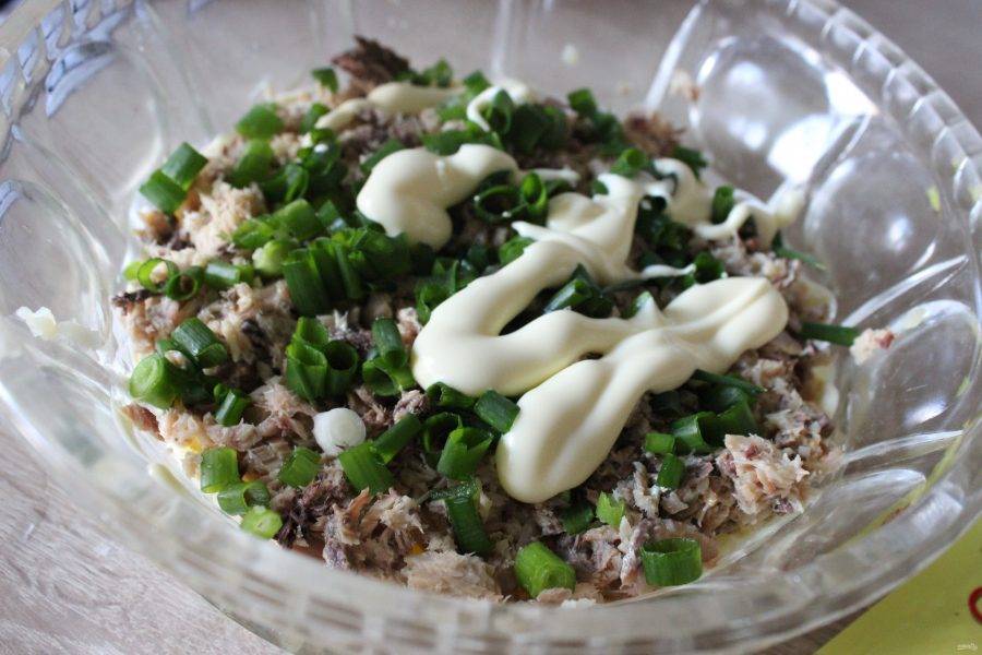 2 слой — размятые вилкой рыбные консервы + порезанный зеленый лук.