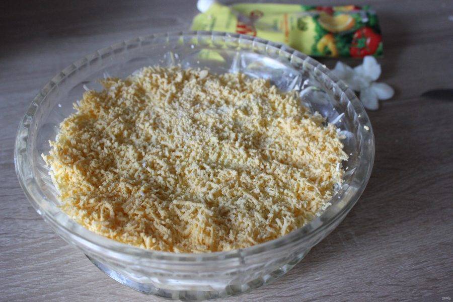 3 слой — тертые на средней терке яичные белки. Если будете украшать салат "цветочками", предварительно вырежьте их, остальной белок идет в салат.