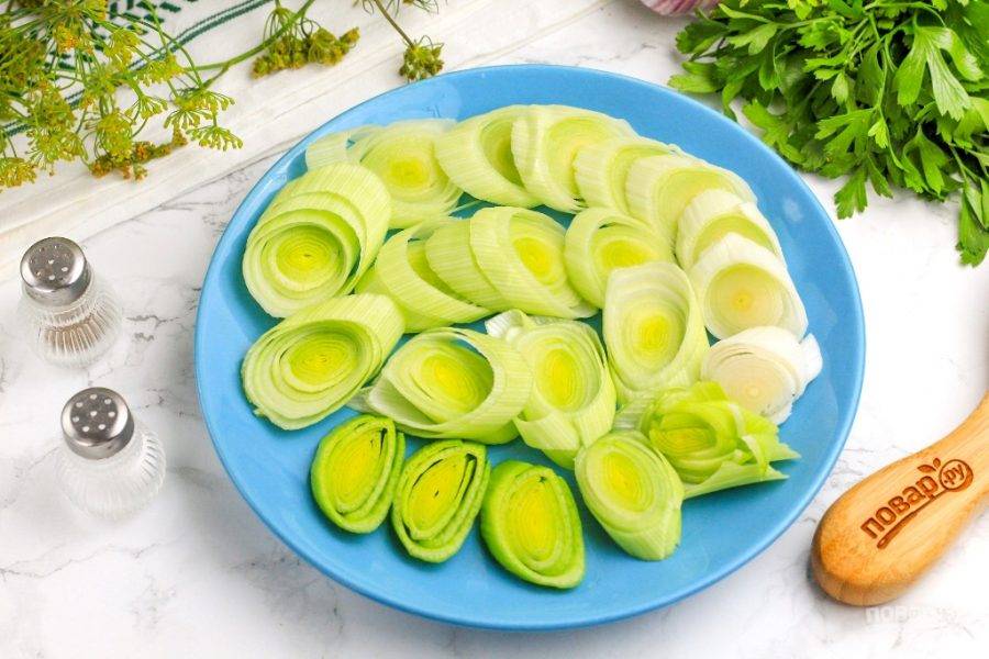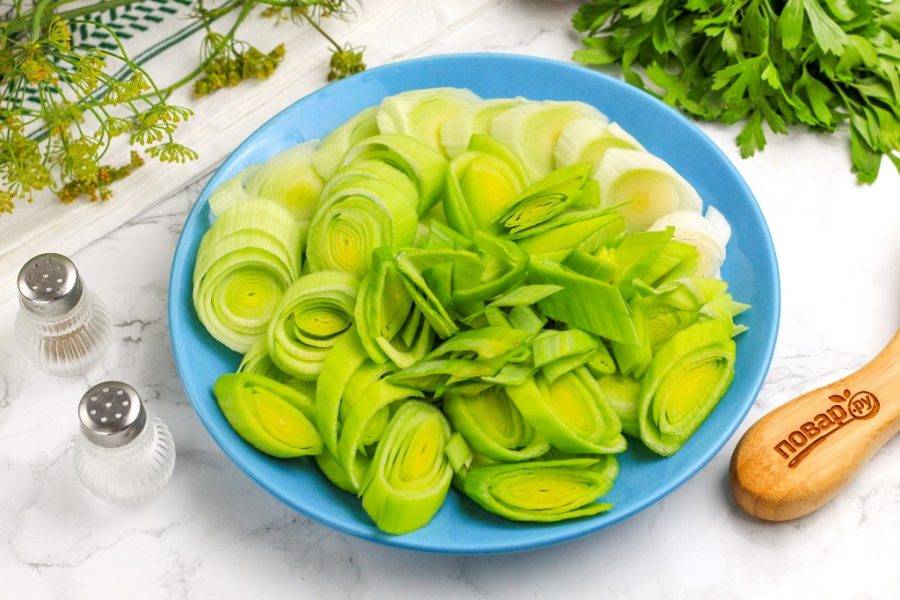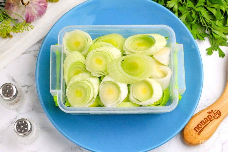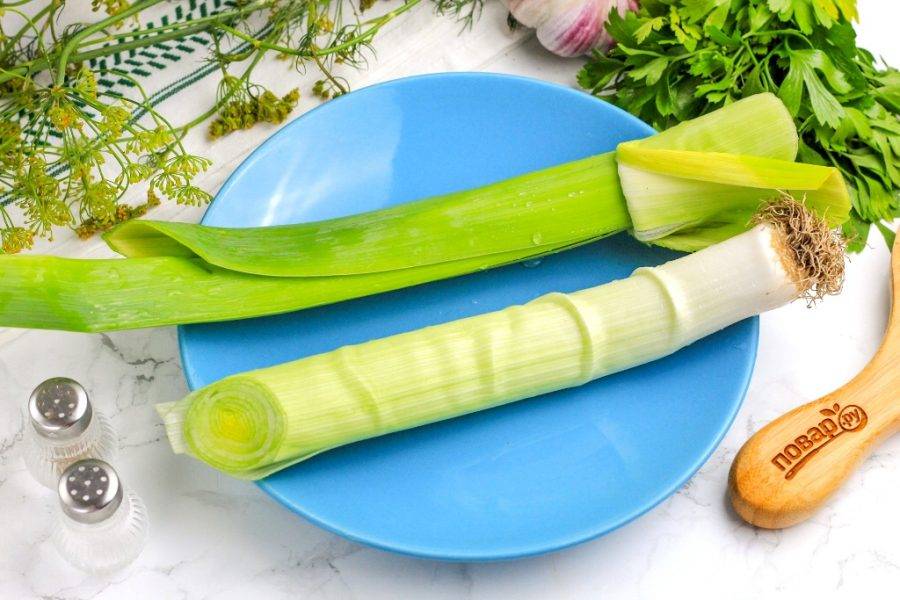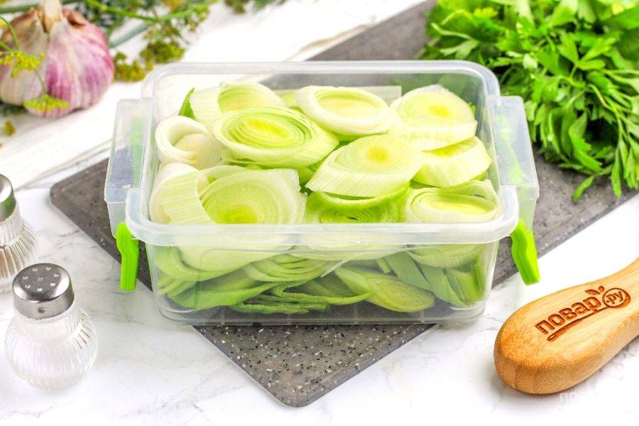Подготовьте указанные продукты. Приобретите крупный стебель лука-порея и промойте его в воде. Срежьте корни и подвявшие листья. Если у вас крупный урожай, то заготовьте таким образом несколько контейнеров с луком.